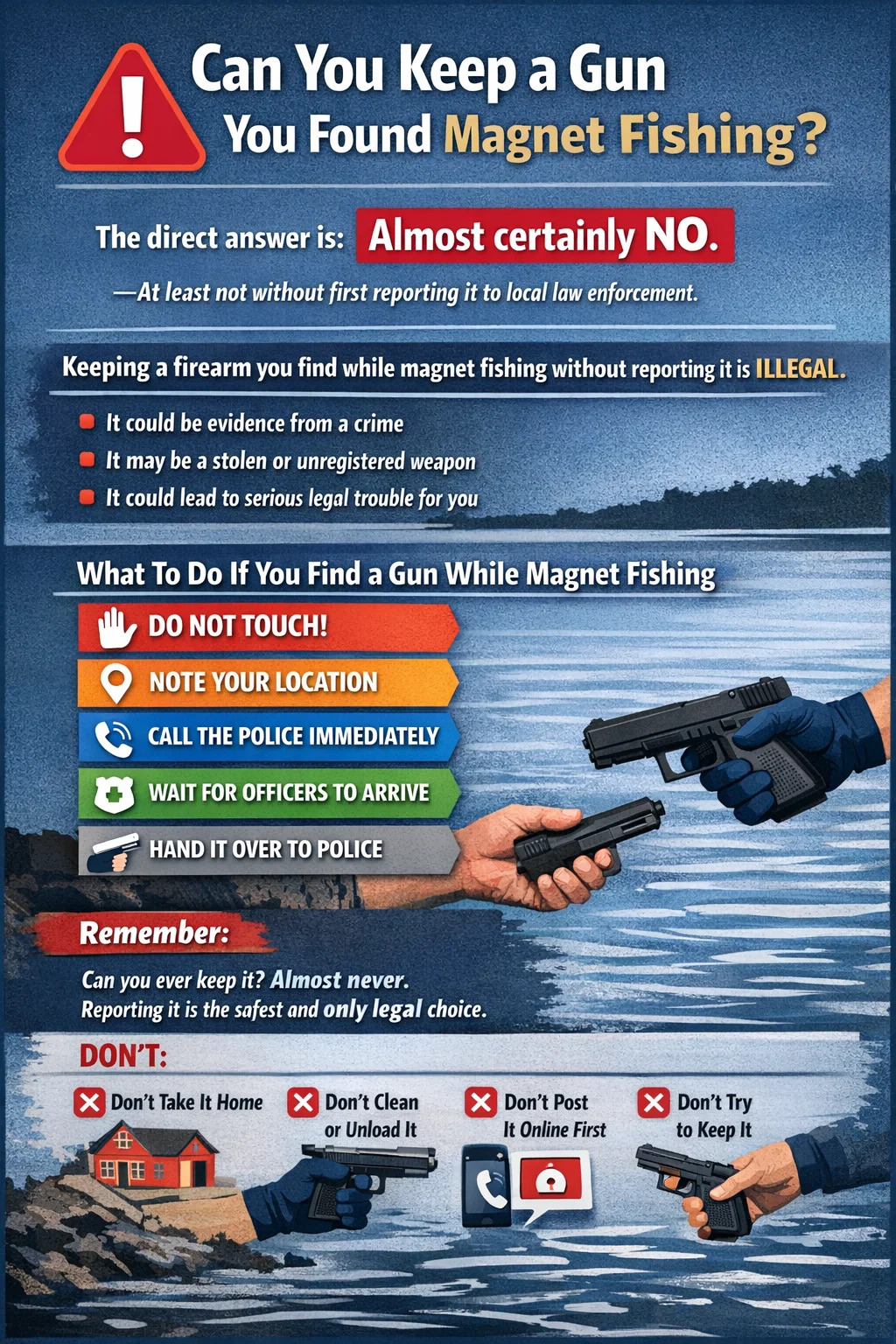 Magneettikalastus on palkitseva harrastus, jolla on aitoja yleisen turvallisuuden etuja – vastuulliset harrastajat ovat auttaneet poistamaan tuhansia vaarallisia esineitä yleisiltä vesistöiltä. Mutta sama vastuu ulottuu siihen, kuinka käsittelet vakavia löytöjä, kuten tuliaseita. Ilmoita siitä, luovuta se ja anna oikeudenkäyntiprosessin kulkea. Tämä on sekä juridisesti oikea että moraalisesti oikea lähestymistapa, ja se suojelee sinua, muita ihmisiä ja magneettikalastusyhteisön pitkän aikavälin mainetta.