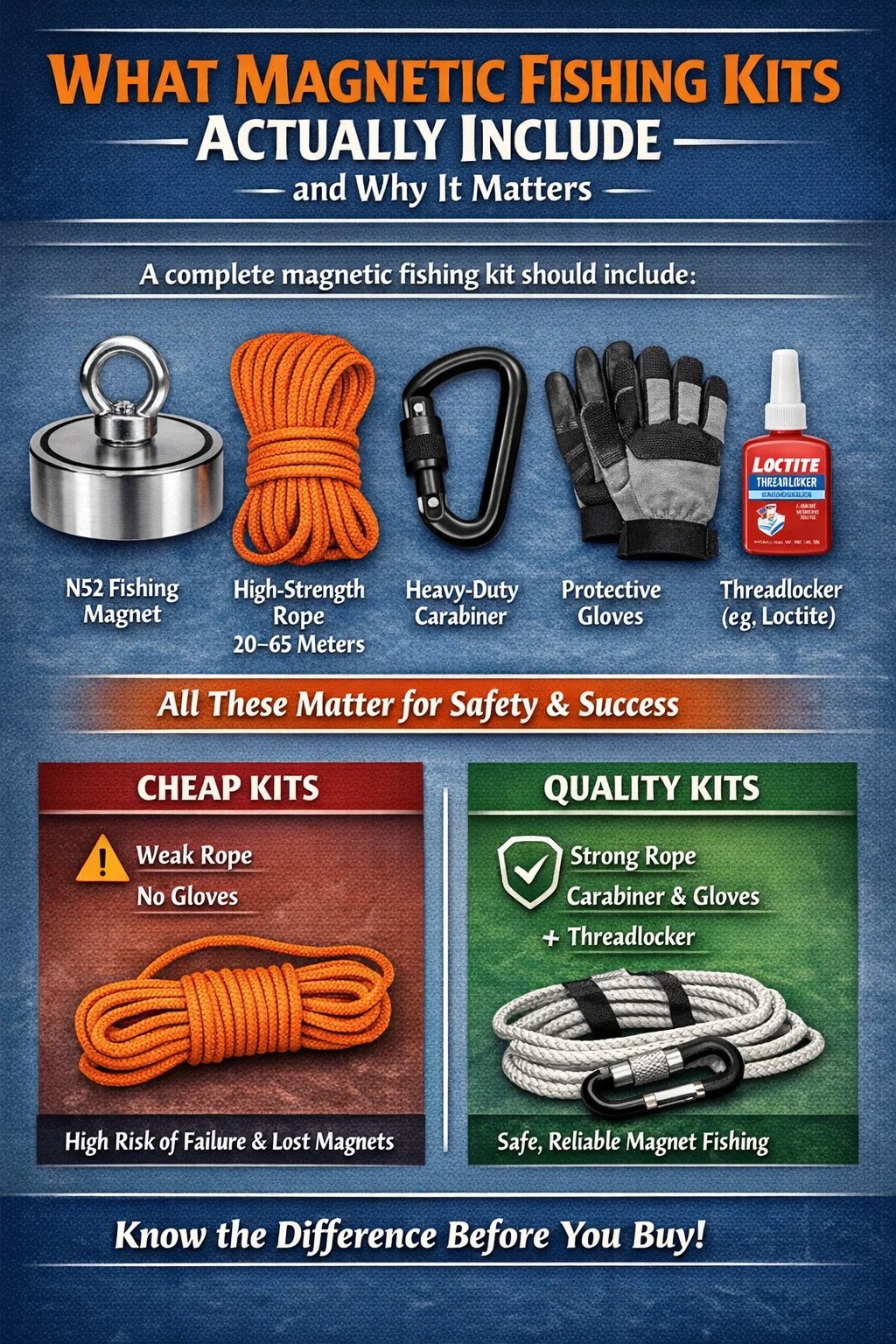 Jos etsit suoraa vastausta: Täydellinen magneettikalastussarja sisältää neodyymikalastusmagneetin, lujan köyden (yleensä 20–65 metriä), lukittavan karabiinin, suojakäsineet ja usein kierrelukitusseoksen, kuten Loctiten. Nämä komponentit yhdessä määrittävät, onko magneettikalastuskokemuksesi tuottava ja turvallinen – vai turhauttavaa ja vaarallista. Halvat sarjat, joissa hansikkaat ohitetaan tai joissa käytetään huonolaatuista köyttä, aiheuttavat suurimman osan online-magneettikalastusyhteisöissä raportoiduista onnettomuuksista ja kadonneista magneeteista.