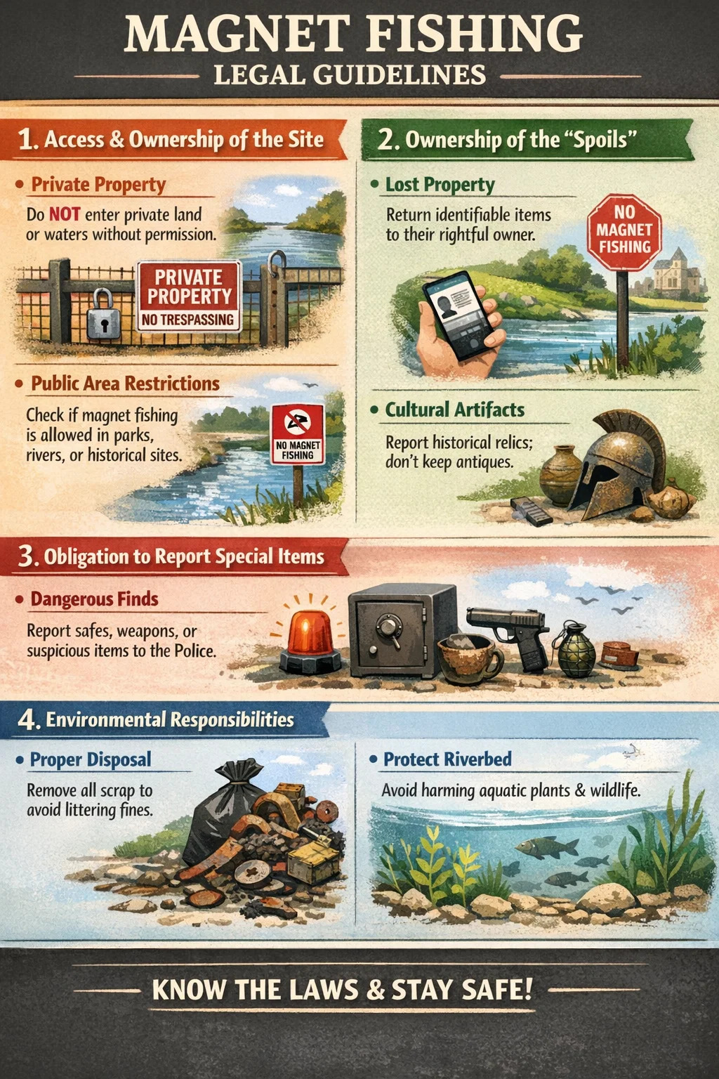 Ennen kuin aloitat magneettikalastuksen, on tärkeää ymmärtää asiaankuuluvat lait ja määräykset. Vaikka tätä toimintaa pidetään monin paikoin positiivisena tapana puhdistaa ympäristöä, laillisesti se sisältää erilaisia näkökohtia, kuten maaoikeuksia, haettujen esineiden omistusta ja yleistä turvallisuutta.