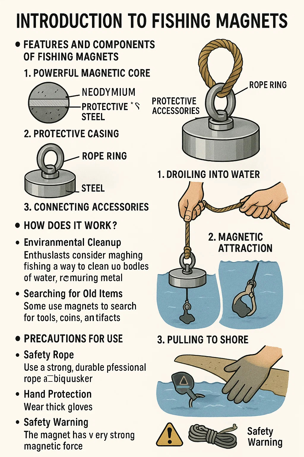 Kalastusmagneetti, kuten nimestä voi päätellä, on voimakas magneettityökalu, jota käytetään "kalastamaan" rautapitoisia esineitä vesistöjen pohjalla tai vaikeapääsyisissä paikoissa. Se käyttää vahvaa magneettista voimaa metalliesineiden houkuttelemiseen ja noutamiseen korvaten perinteiset koukut ja köydet.