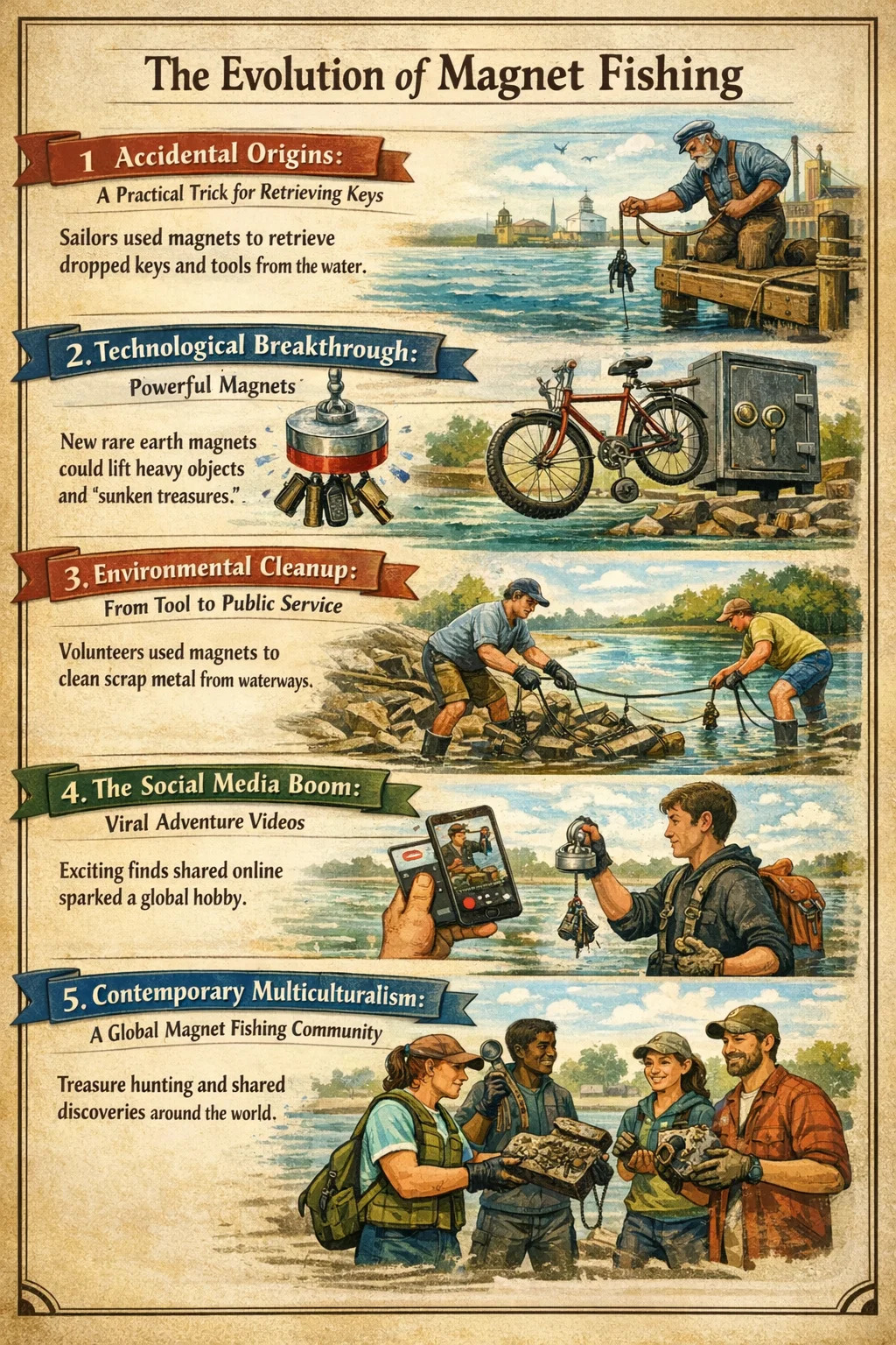 Magneettikalastuksen keksimiselle ei ole tarkkaa historiallista hetkeä, kuten hehkulampun keksinnöstä. Sen sijaan se kehittyi vähitellen käytännön elämän hackista maailmanlaajuisesti suosituksi ulkoiluharrastukseksi.